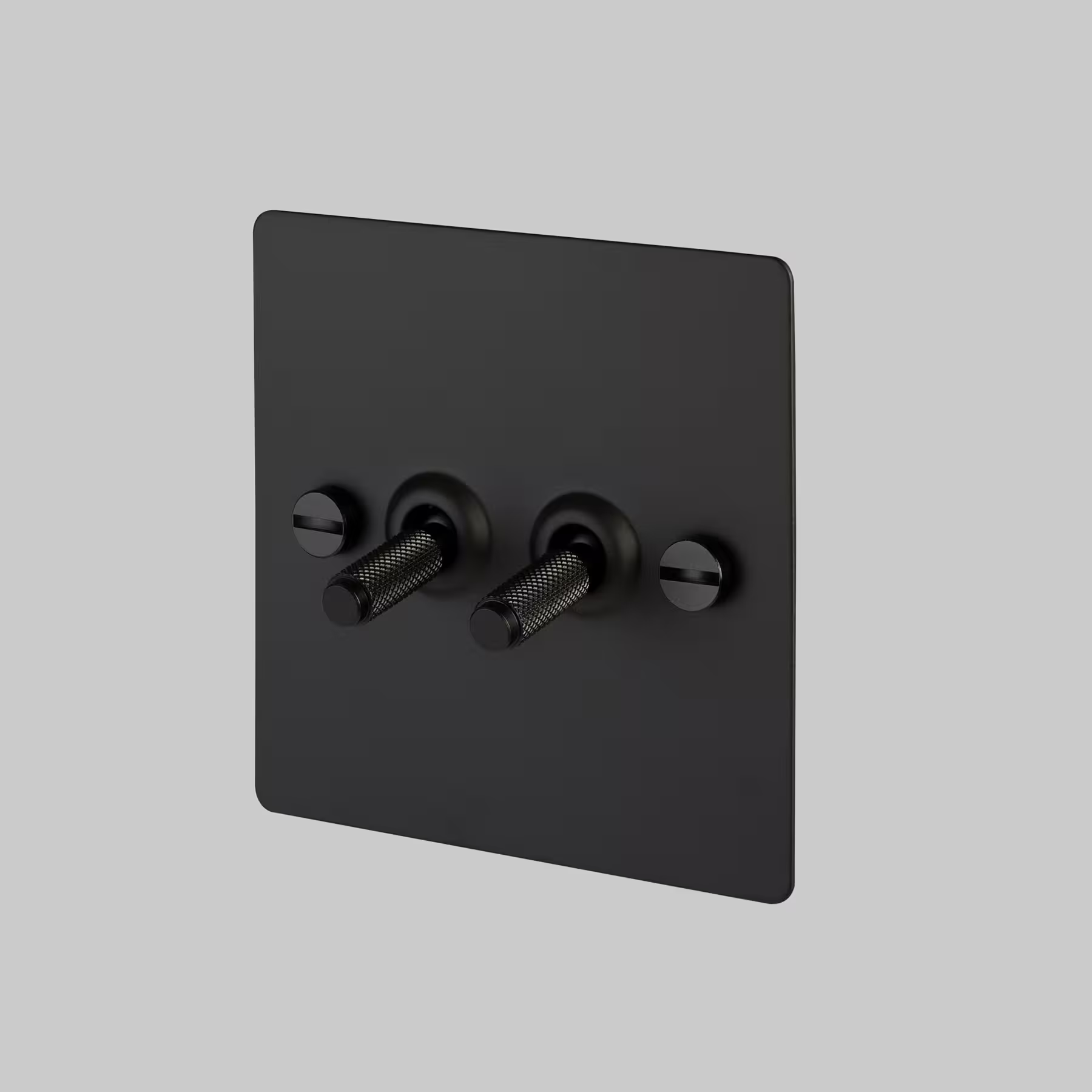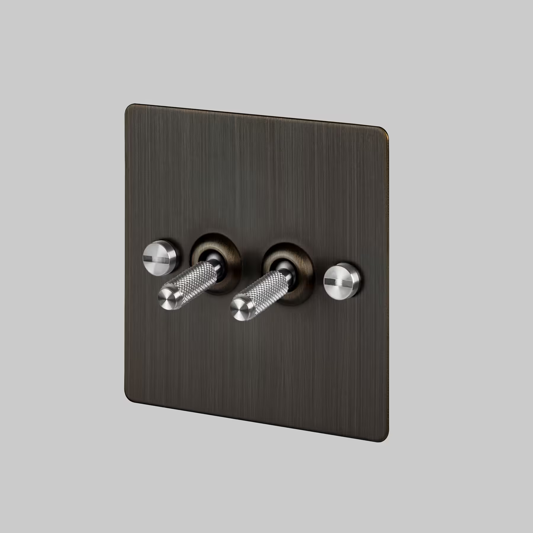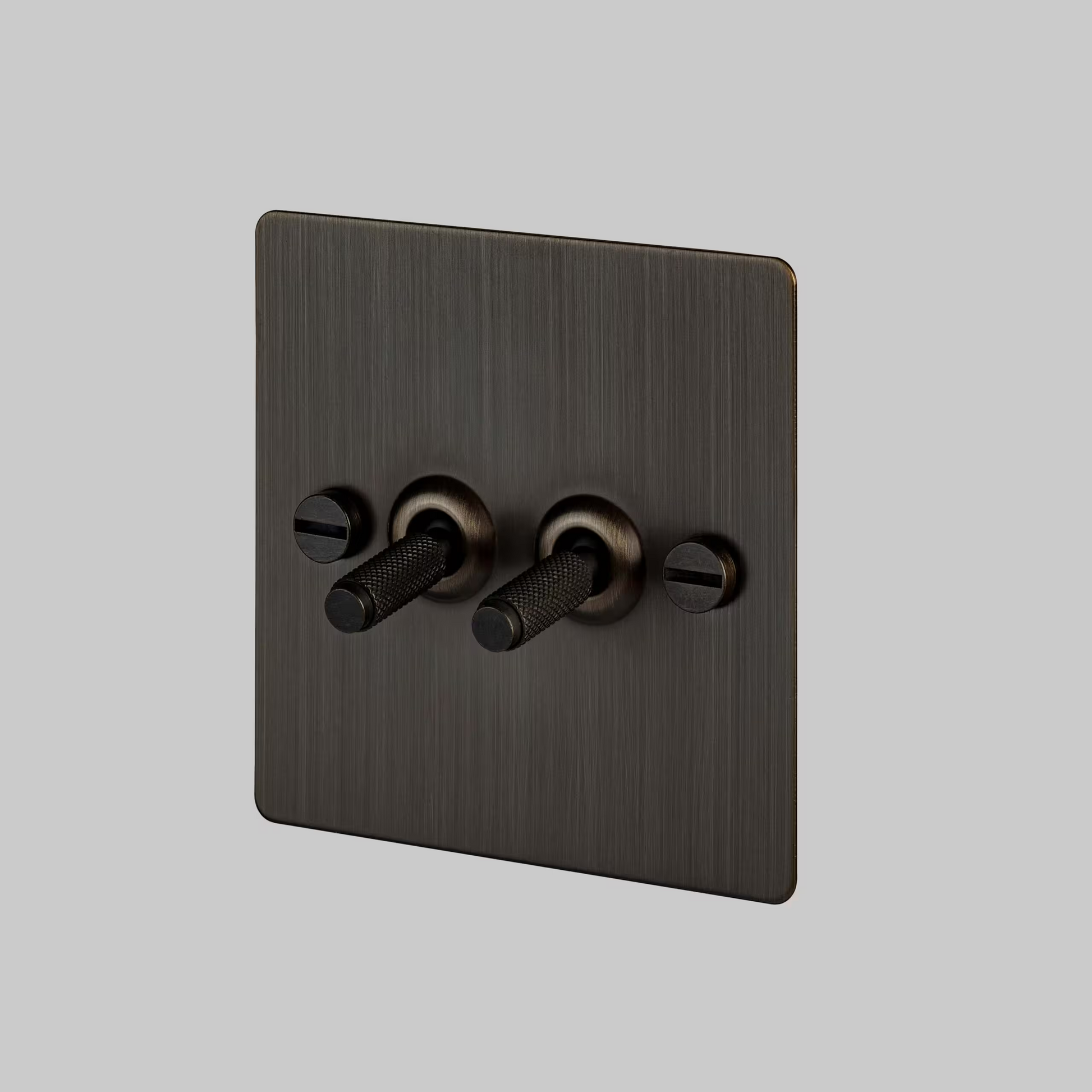 The toggle switch features a lightly brushed flat plate, fixed with our signature solid smoked bronze coin screws.