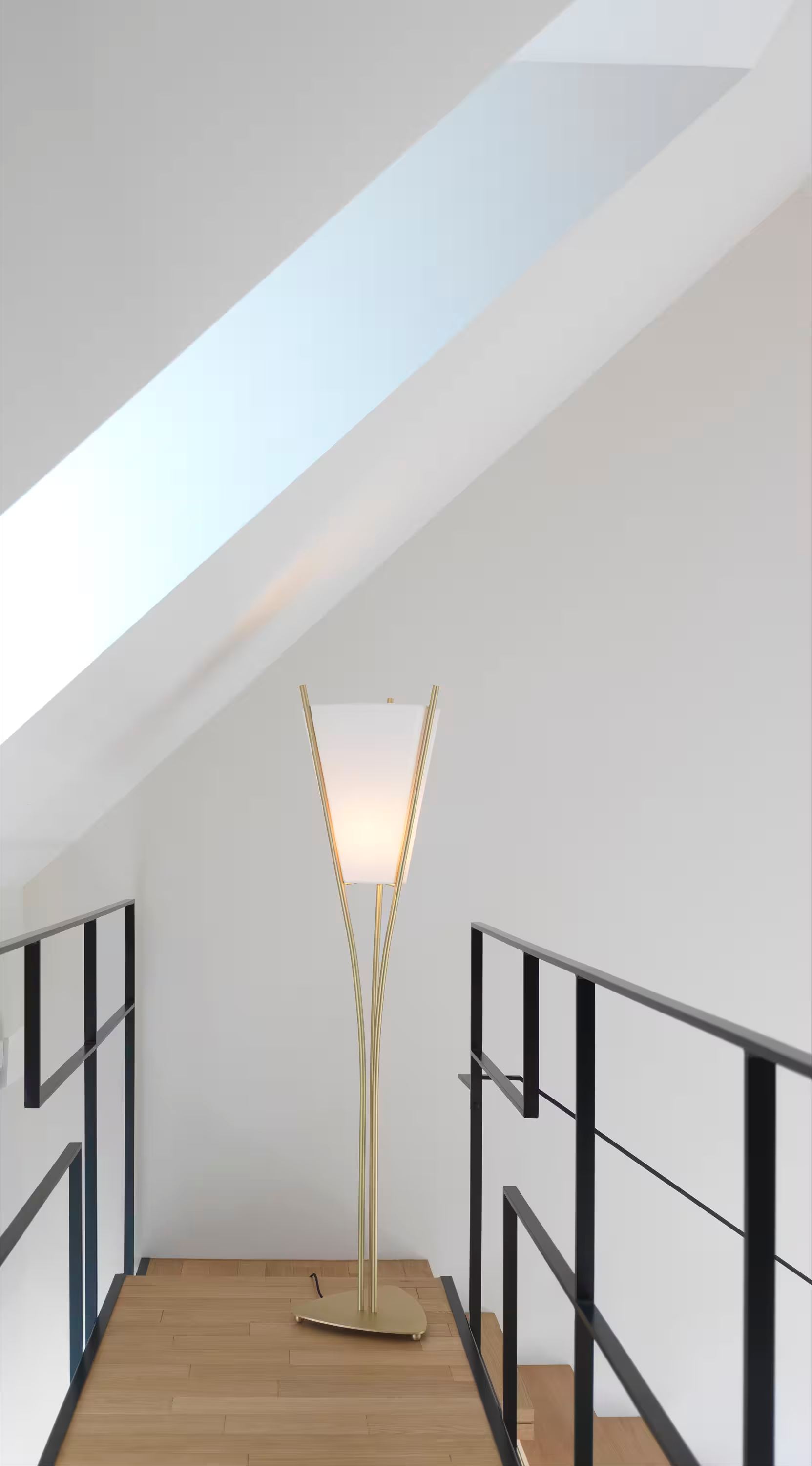 Three formats come to compose this collection with singular lines. The two floor lamps and the Curve lamp are arranged around a curved triangular lampshade extended by the foot line.
