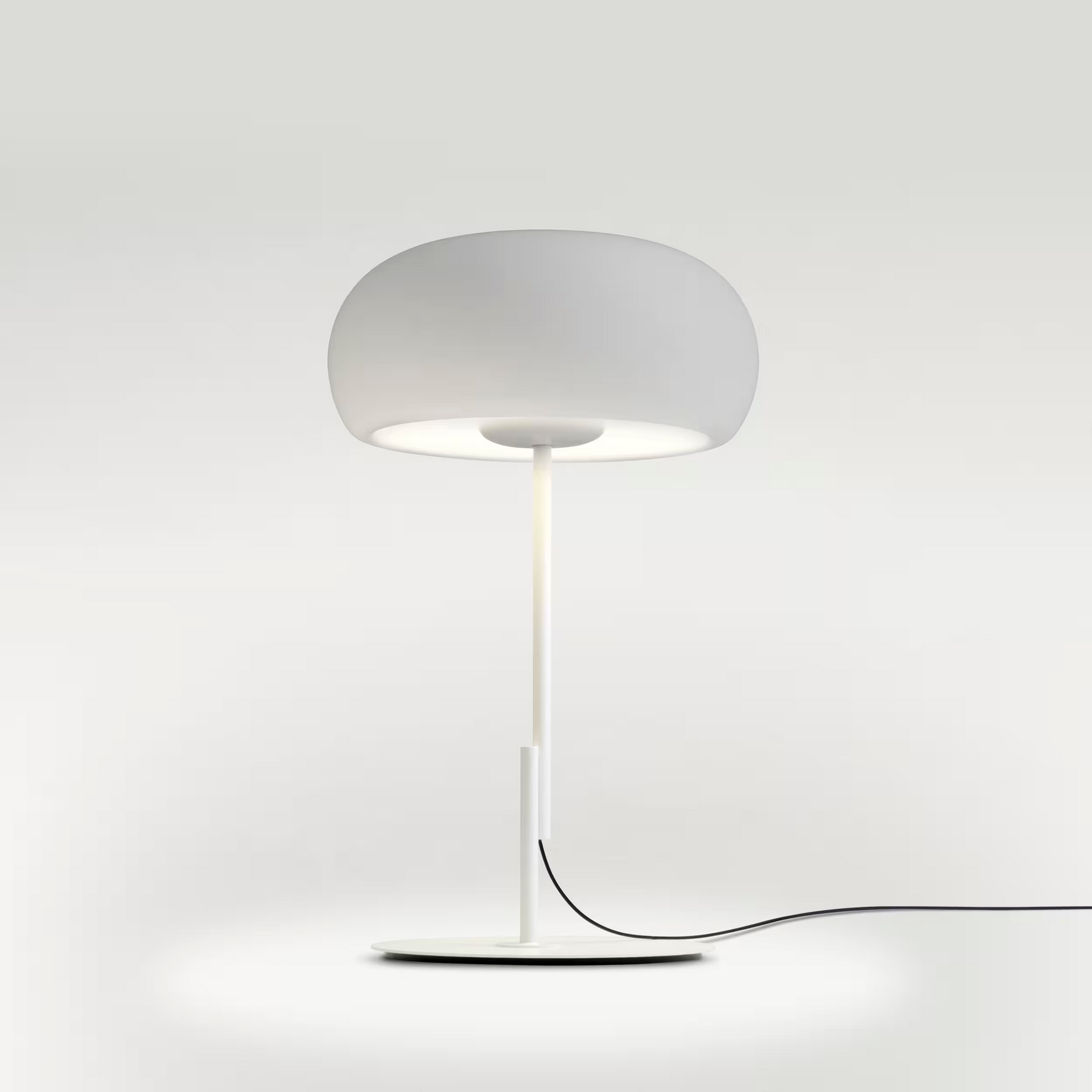 This collection was designed in table, suspension and floor models in different diameters (20, 32 and 43 cm). In the table and floor versions, the stem is divided into two unequal parts, a feature that breaks the symmetry, adds beauty and elegantly provides an outlet for the cable.